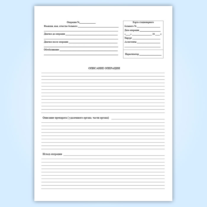 На каждую операцию отводится отдельный лист, в котором подробно описывается ход операции, указывается вид обезболивания, доза наркотического средства, отмечается продолжительность операции, состояние больного во время оперативного вмешательства. А также указываются лечебные мероприятия, проводившиеся во время операции (инъекции сердечных средств, дача кислорода и др.), записываются фамилии оперирующих врачей и наркотизатора, исход операции.