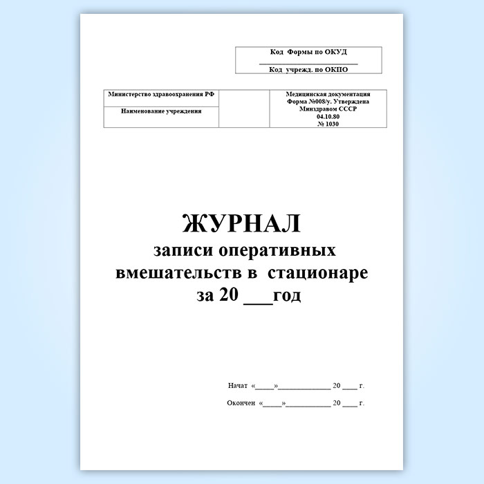 Форма журнала записи оперативных вмешательств в стационаре за год форма 008/у утверждена Приказом Минздрава СССР №1030 «Об утверждении форм первичной медицинской документации учреждений здравоохранения» от 4 октября 1980 г. Одним из показателей работы стационара является количество проведенных за год операций, которые отражаются в журнале.