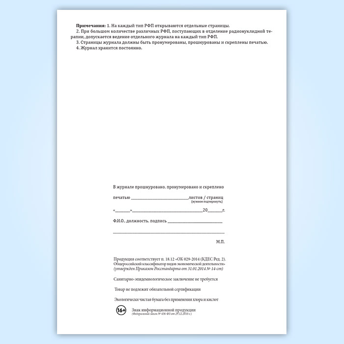 При большом количестве различных РФП, поступающих в отделение радионуклидной терапии, допускается ведение отдельного журнала на каждый тип РФП.