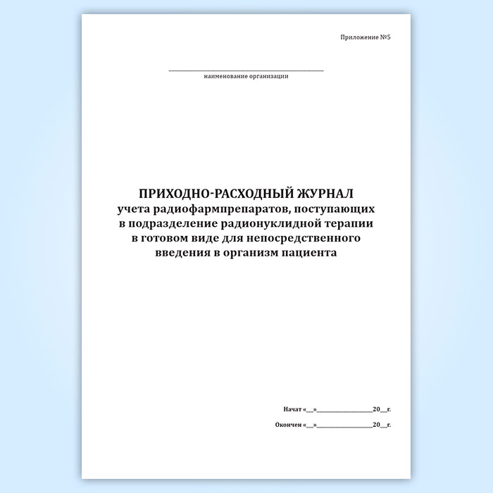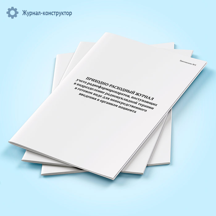 Форма приходно-расходного журнала учета радиофармпрепаратов, поступающих в подразделение радионуклидной терапии в готовом виде для непосредственного введения в организм пациента соответствует Приложению 5 к СанПиН 2.6.1.2368-08. Гигиенические требования по обеспечению радиационной безопасности при проведении лучевой терапии с помощью открытых радионуклидных источников.