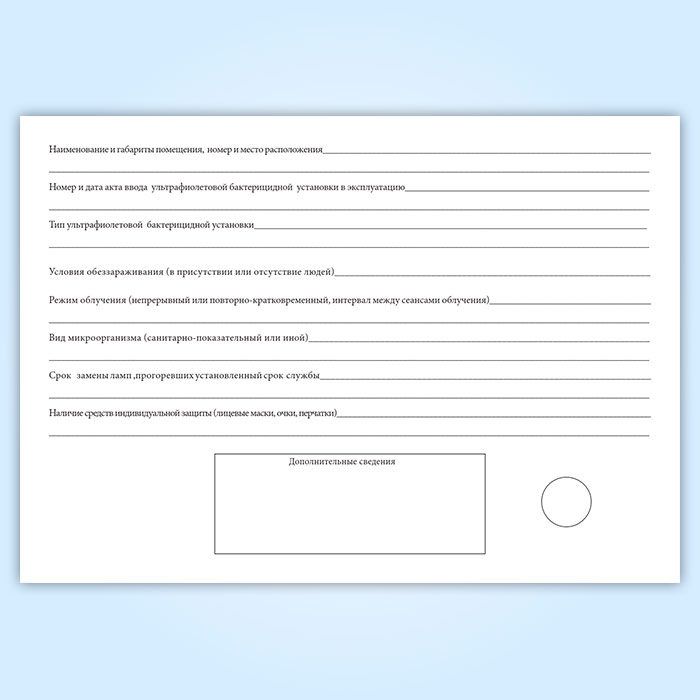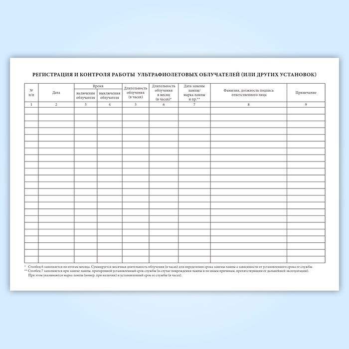 Учет и контроль работы ультрафиолетовых облучателей (или других установок) регистрируется в журнале, где указывается длительность облучения и дата замены лампы.