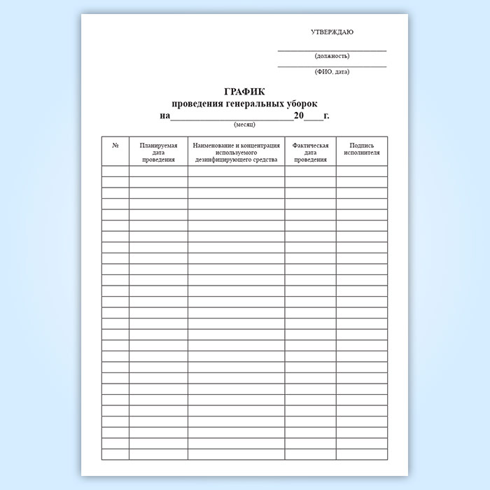 Учет проведения генеральных уборок в обсерваторе ведется в журнале с указанием наименования и концентрации используемого дезинфицирующего средства и фактической даты проведения уборки.