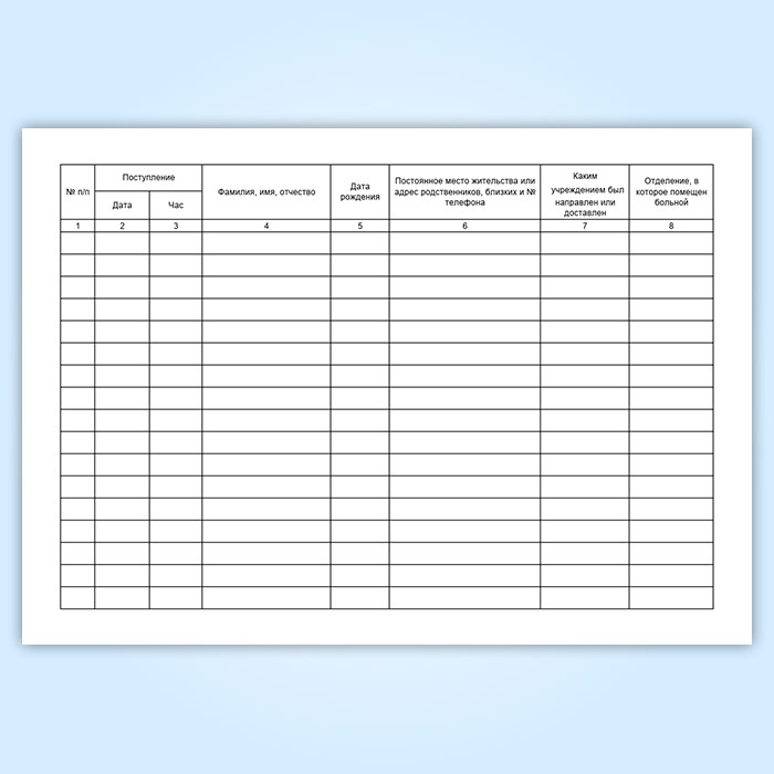 Журнал служит для регистрации больных, поступающих в стационар. Записи в журнале позволяют разрабатывать данные о поступивших больных, о частоте и причинах отказов в госпитализации. Его ведут в приемном отделении больницы, один на всю больницу.
