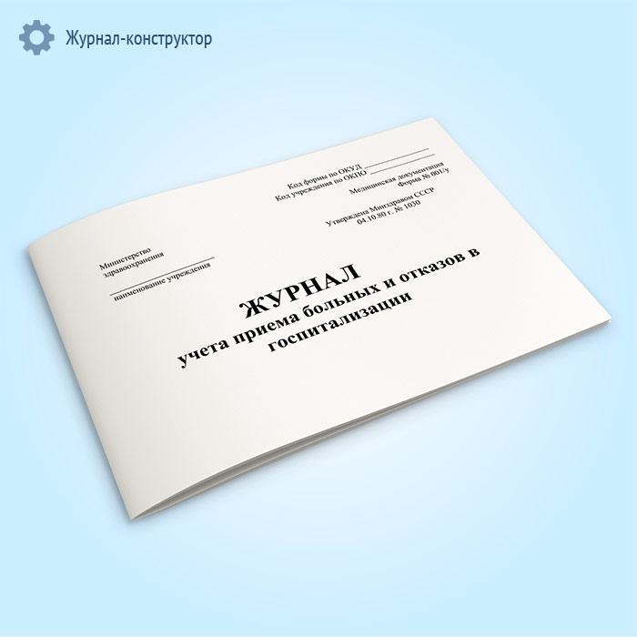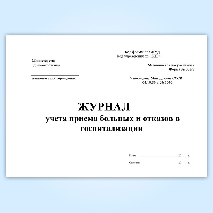 Форма журнала учета приема больных и отказов в госпитализации (Форма 001/у) утверждена Приказом Минздрава СССР № 1030 « Об утверждении форм первичной медицинской документации учреждений здравоохранения» от 04 октября 1980 (с изменениями на 31 декабря 2002 года).