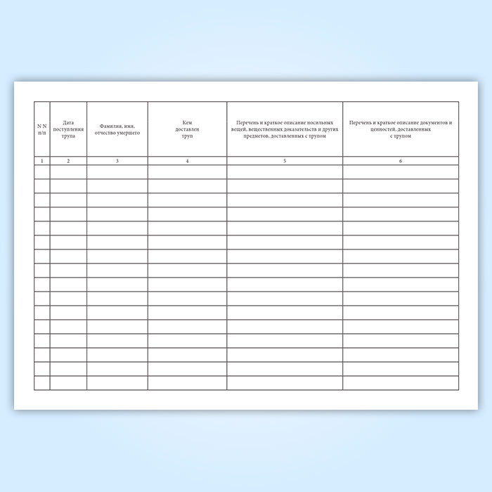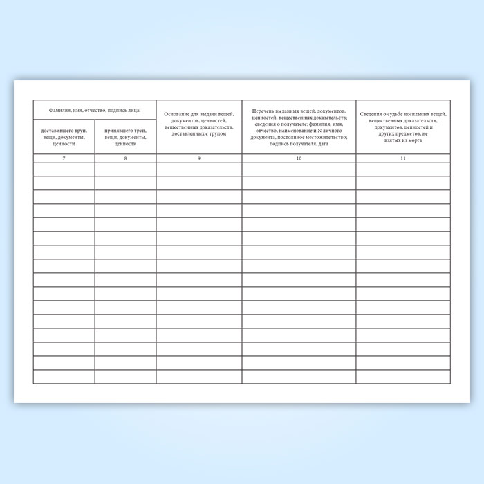 Журнал регистрации носильных вещей, вещественных доказательств, ценностей и документов в морге (Форма 191/у) имеет графы: