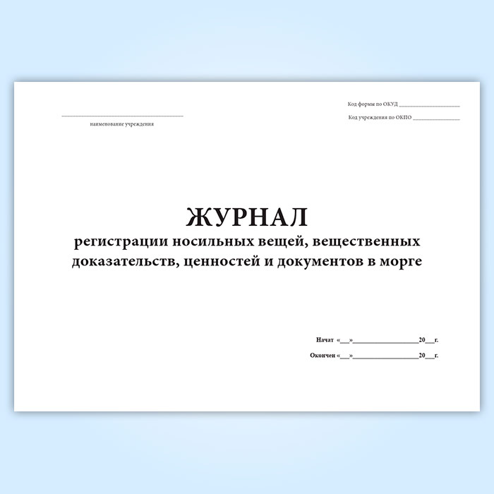 Форма журнала регистрации носильных вещей, вещественных доказательств, ценностей и документов в морге (Форма 191/у) соответствует Приказу Минздрава СССР № 1030 «Об утверждении форм первичной медицинской документации учреждений здравоохранения" от 04 октября 1980 (с изменениями на 31 декабря 2002 года).