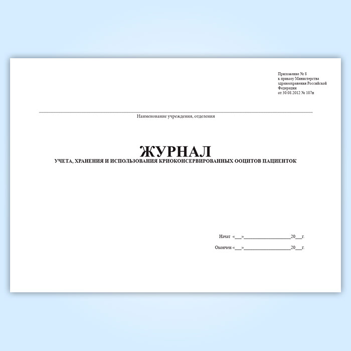 Форма журнала учета, хранения и использования криоконсервированных ооцитов пациенток соответствует Приложению № 8 к Приказу Министерства здравоохранения РФ от 31 июля 2020 г. № 803н "О порядке использования вспомогательных репродуктивных технологий, противопоказаниях и ограничениях к их применению"
