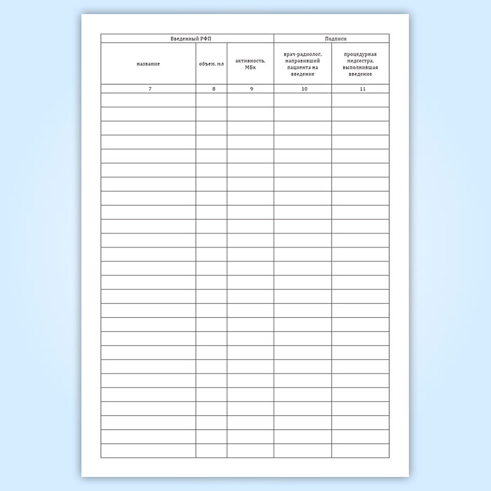Графы журнала введения радиофармпрепаратов пациентам: