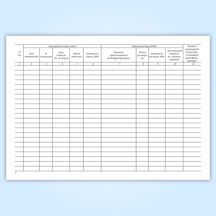 Журнал приготовления рабочих растворов радиофармпрепаратов имеет графы: