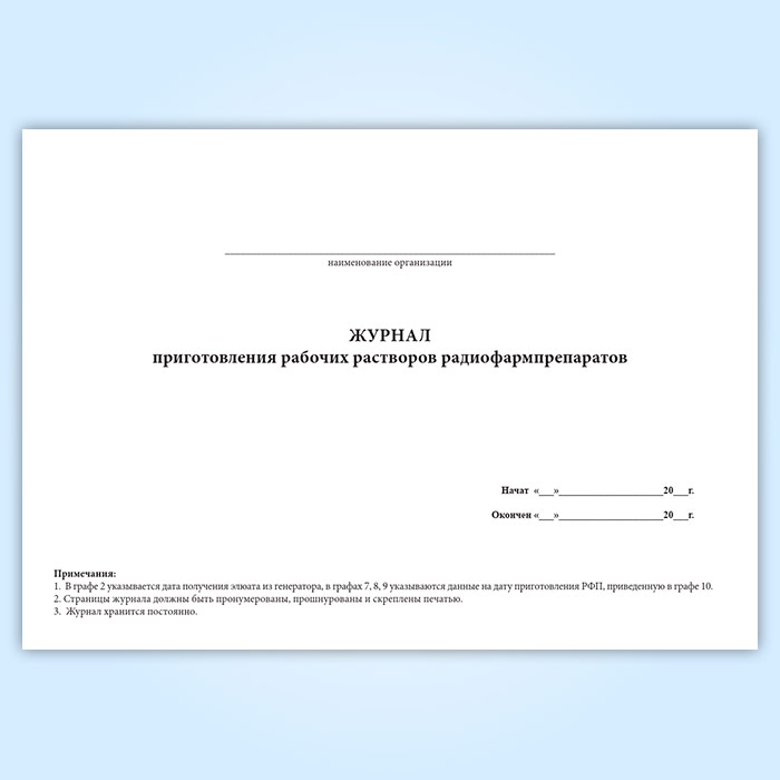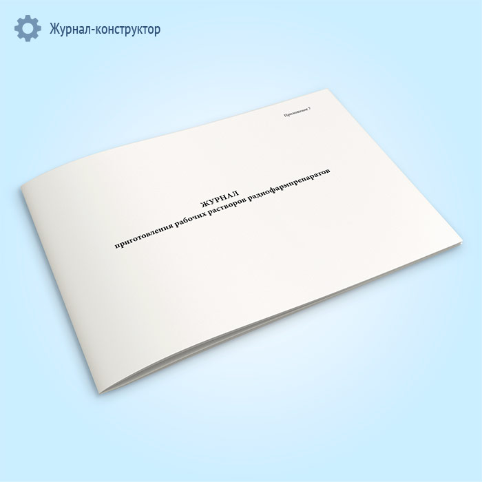 Форма журнала приготовления рабочих растворов радиофармпрепаратов соответствует Приложению 7 к Постановлению Главного государственного санитарного врача РФ СанПиН 2.6.1.2368-08 " Гигиенические требования по обеспечению радиационной безопасности при проведении лучевой терапии с помощью открытых радионуклидных источников" от 16 июня 2008 года.