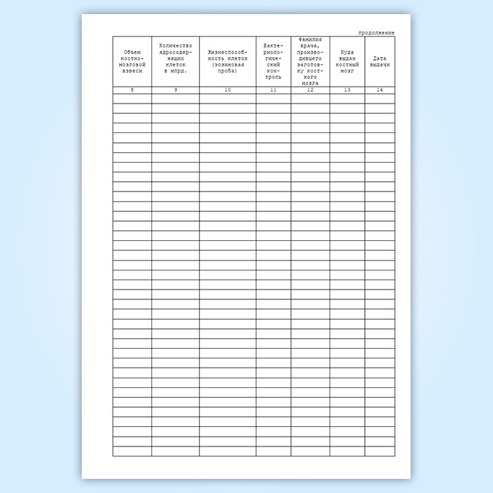 Для учета консервированного костного мозга ведут журнал учета консервированного костного мозга (Форма 024/у) , для учета замороженного костного мозга, находящегося на хранении - журнал учета замороженного костного мозга, находящегося на хранении (Форма N 022/у) . Также используют этикетку на флакон с костным мозгом, размороженным для трансплантации (Форма 041/у) .