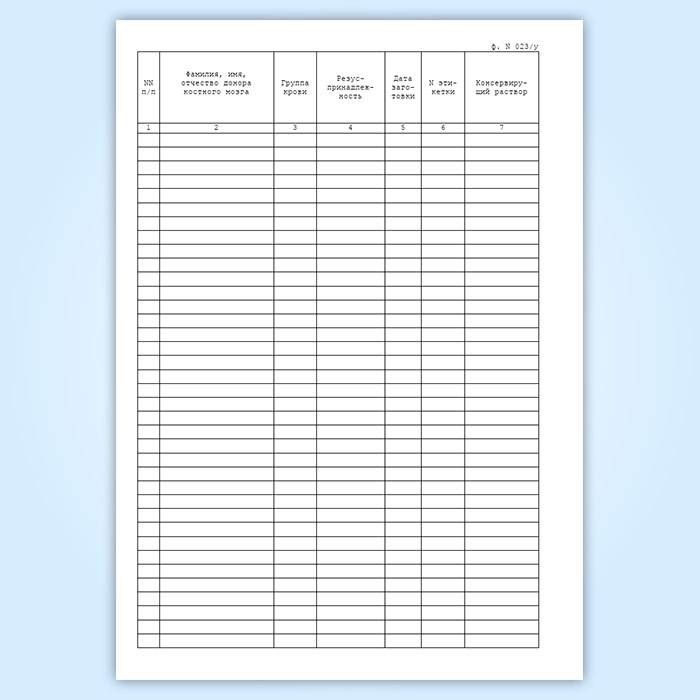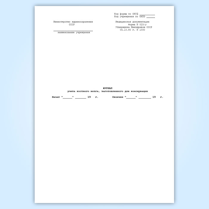 Форма журнала учета костного мозга, заготовленного для консервации (Форма 023/у) утверждена Приказом Минздрава СССР № 1030 " Об утверждении форм первичной медицинской документации учреждений здравоохранения" от 04.10.1980 года (с изм. 31.12.2002)