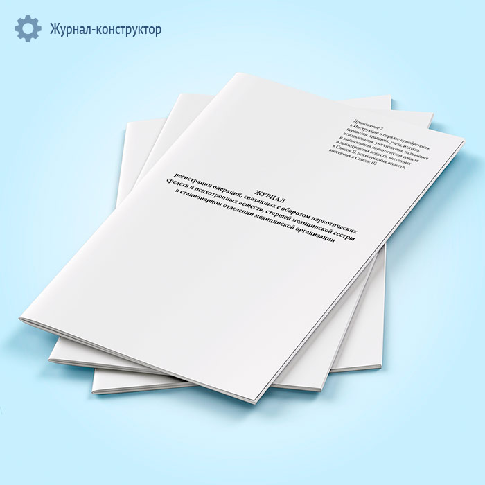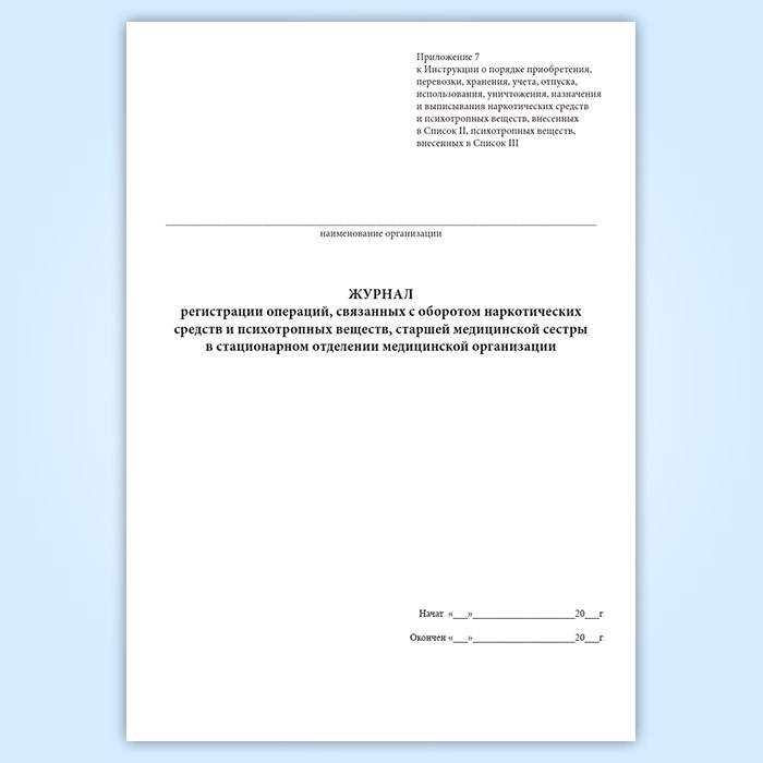 Форма журнала регистрации операций, связанных с оборотом наркотических средств и психотропных веществ старшей медицинской сестры в стационарном отделении медицинской организации соответствует Приложению 7 к Приказу от 11 декабря 2015г. №1077 " О порядке приобретения, перевозки, хранения, учета, отпуска, использования, уничтожения, назначения и выписывания наркотических средств, внесенных в список II перечень, психотропных веществ, внесенных в список III перечня, в медицинских организациях государственной системы здравоохранения города Москвы" .