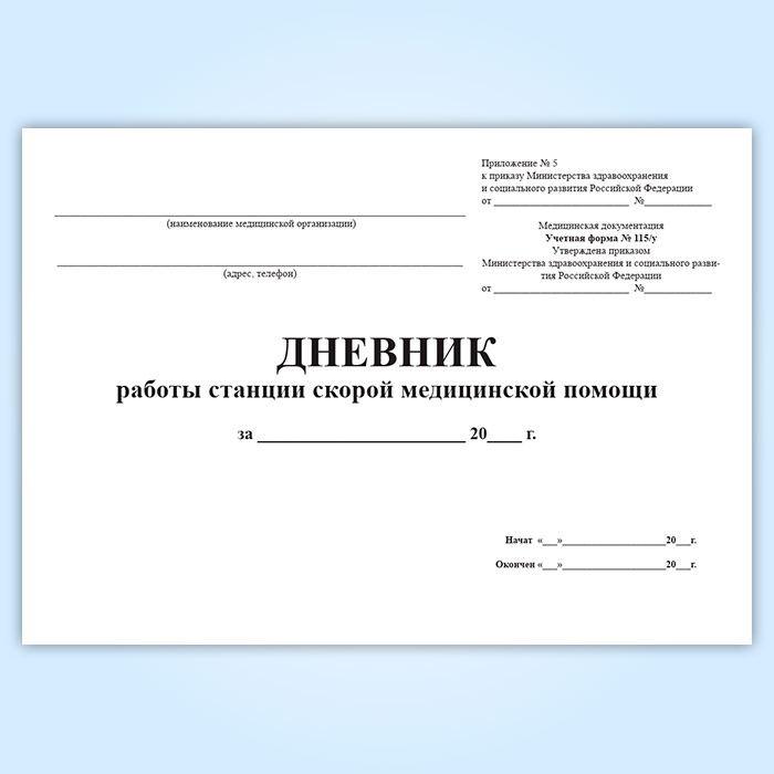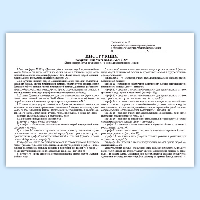 Форма дневника работы станции скорой медицинской помощи (Форма 115/у) соответствует Приложению 5 к Приказу Минздравсоцразвития России № 942 «Об утверждении статистического инструментария станции (отделения), больницы скорой медицинской помощи» от 02 декабря 2009 года.