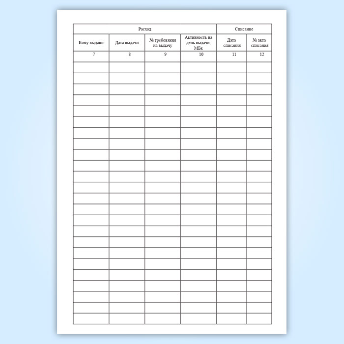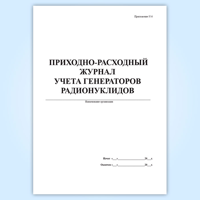 Форма приходно-расходного журнала учета генераторов радионуклидов соответствует Приложению 6 к СанПиН 2.6.1.2368-08 «Гигиенические требования по обеспечению радиационной безопасности при проведении лучевой терапии с помощью открытых радионуклидных источников.