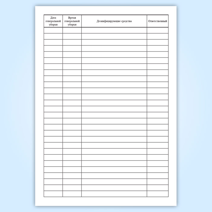 Сведения о ее выполнении заносятся в специальный журнал генеральной уборки процедурного кабинета (изолятора).