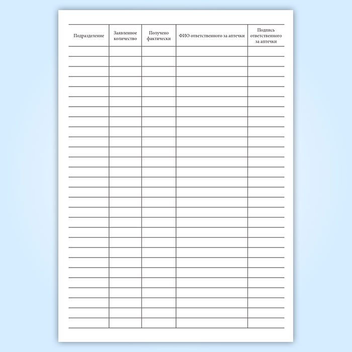 Лист регистрации использования аптечек первой медицинской помощи хранится вместе с аптечкой первой помощи в общедоступном месте на территории подразделения. По требованию надзорных органов или инженера по охране труда лицо, ответственное за использование аптечек первой медицинской помощи, обязано предоставить журнал регистрации использования аптечки первой помощи.