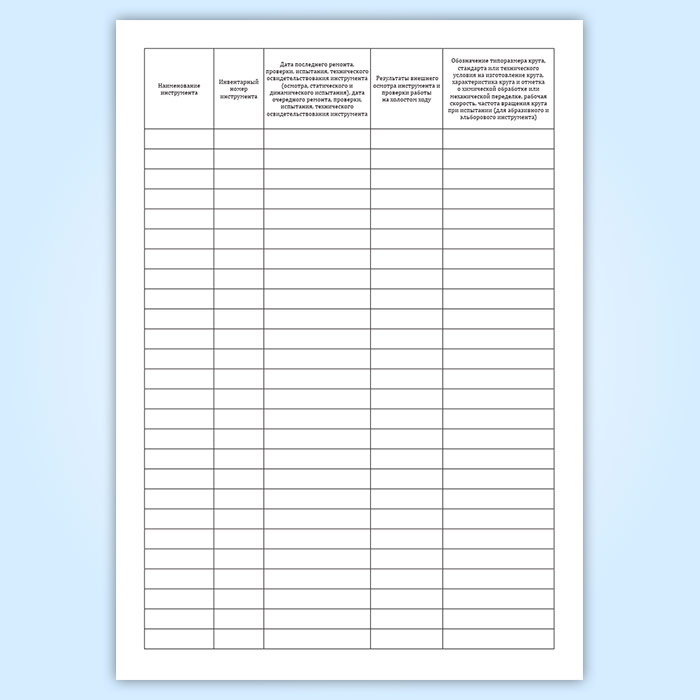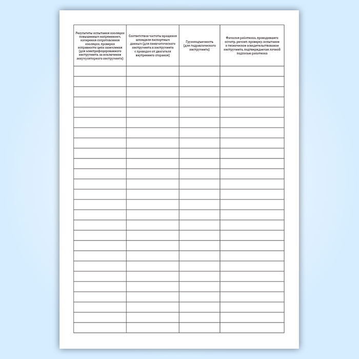 Результаты осмотров, ремонта, проверок, испытаний и технических освидетельствований инструмента (за исключением ручного инструмента), проведенных с периодичностью, установленной организацией-изготовителем, заносятся работником, ответственным за содержание инструмента в исправном состоянии, в журнал, в котором рекомендуется отражать следующие сведения: