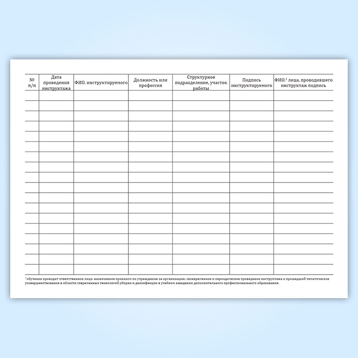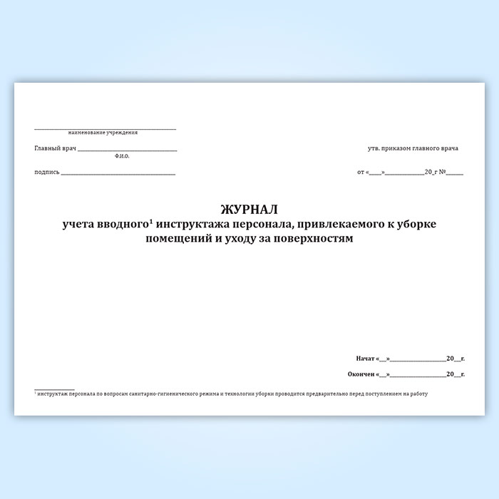 Вводный инструктаж персонала, который привлекается к уборке помещений и к уходу за поверхностями, проводит ответственное лицо, назначенное приказом по учреждению за организацию. Данный сотрудник перед проведением инструктажей проходит тематическое усовершенствование в области современных технологий уборки и дезинфекции в учебном заведении дополнительного профессионального образования. Учет проводимых инструктажей фиксируют в журнале.