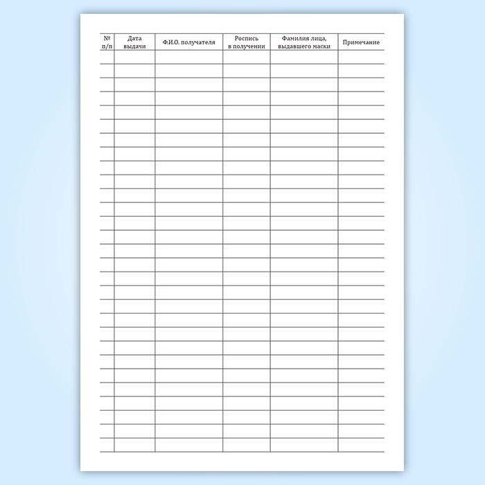 См. также Журнал регистрации выдачи медицинских масок работникам для профилактики коронавируса, графы которого отличаются.