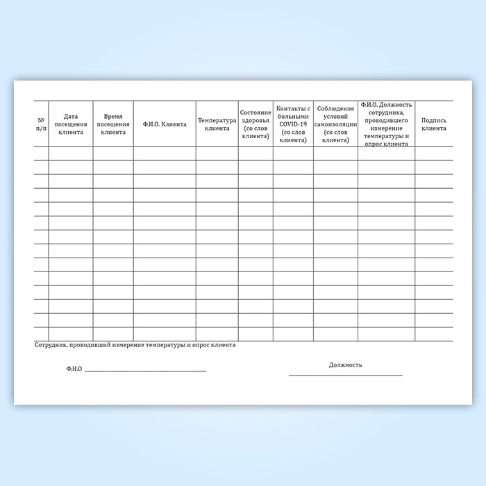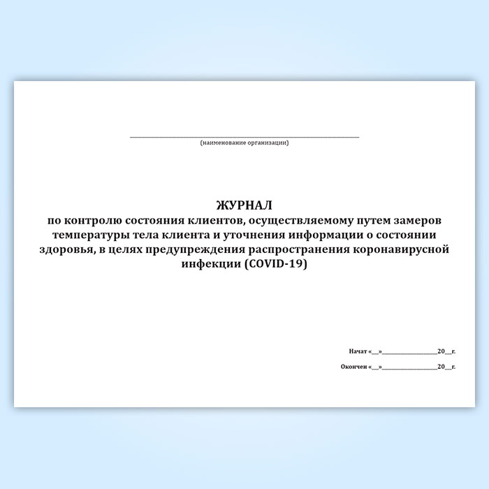 В связи с разрешением открытия ряда предприятий торговли и сферы услуг рекомендуется ведение контроля состояния клиентов, осуществляемому путем замеров температуры тела клиента и уточнения информации о состоянии здоровья, в целях предупреждения распространения коронавирусной инфекции (COVID-19) с фиксацией результатов в журнале.