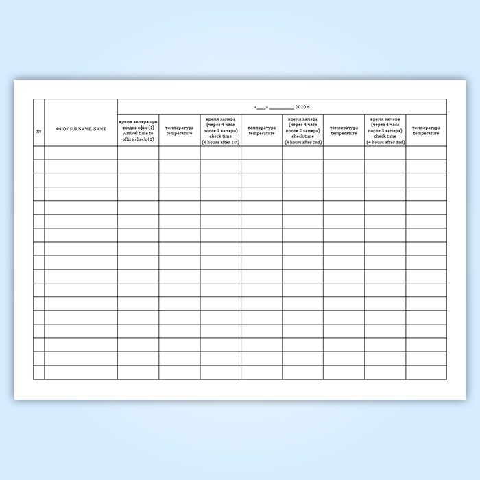 В журнале регистрируется температура тела работников для контроля и предотвращения распространения вирусной инфекции. Журнал на двух языках (русском и английском).