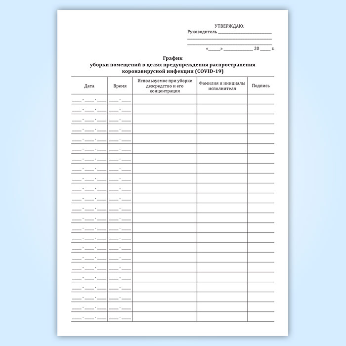 В целях предупреждения и профилактики распространения коронавирусной инфекции возникает потребность в регулярном проведении уборки помещений с использованием дезинфицирующих средств согласно утвержденному графику руководителя, который указан в журнале.