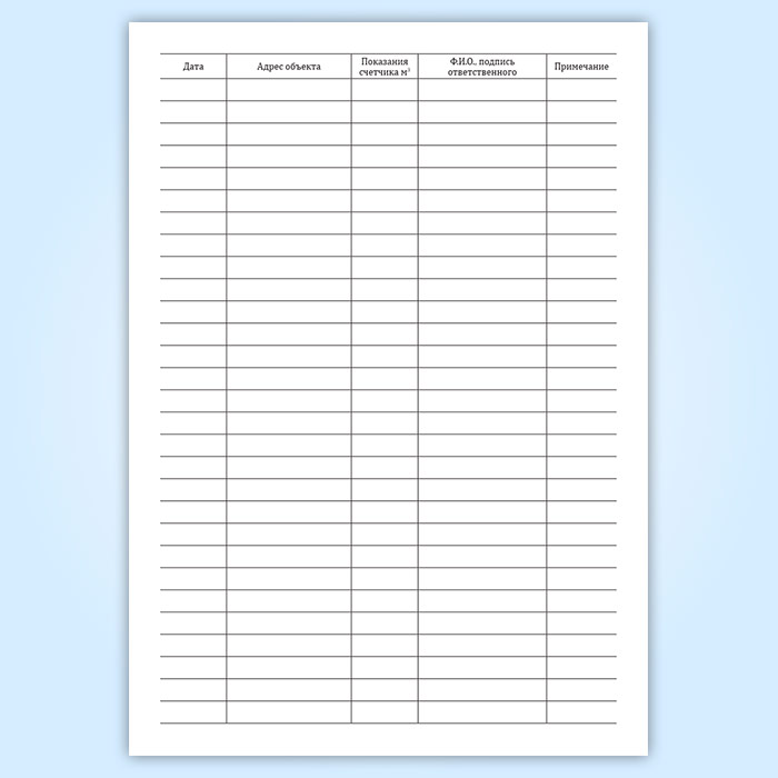 Журнал учета расхода чистой воды включает в себя алгоритм действий, направленных на оптимизацию процессов подсчета, контроля и учета, в котором указан адрес объекта и показания счетчика.