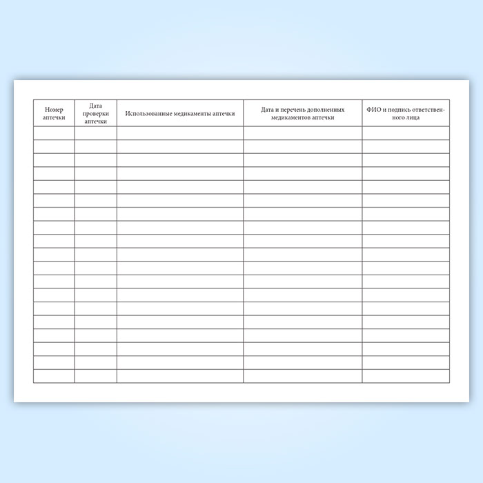 В организации должен вестись журнал регистрации и учета использования изделий медицинского назначения, в котором после проведения ревизии аптечки отмечают дату проверки и ставят подпись ответственного лица