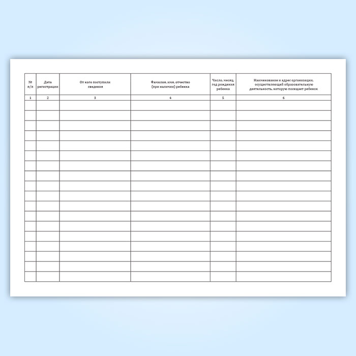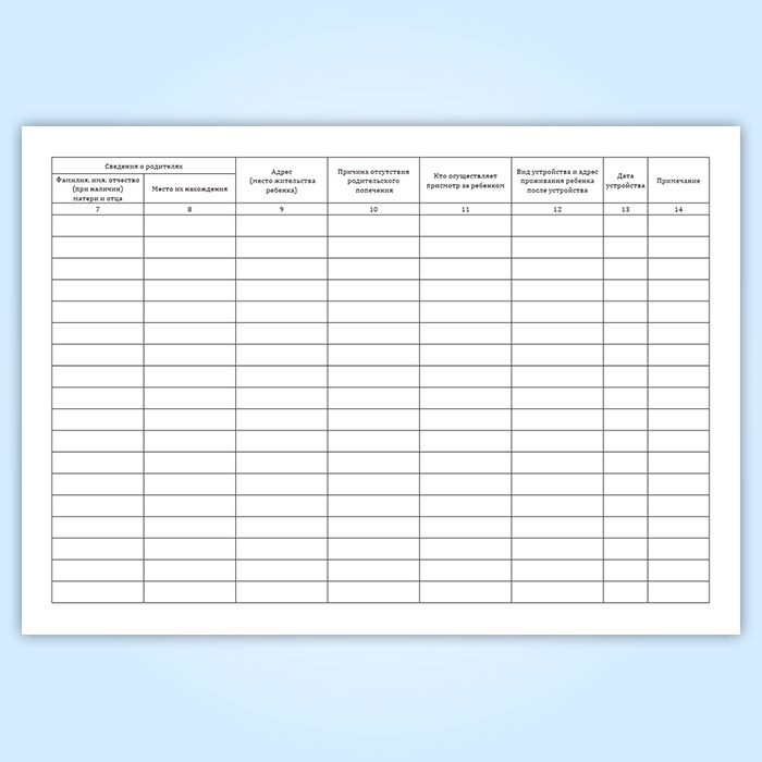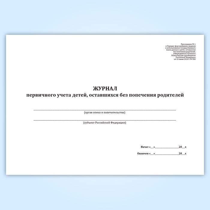 Форма журнала соответствует Приложению 1 к Приказу Минпросвещения России от 15.06.2020 N 300 " Об утверждении Порядка формирования, ведения и использования государственного банка данных о детях, оставшихся без попечения родителей"