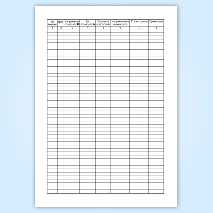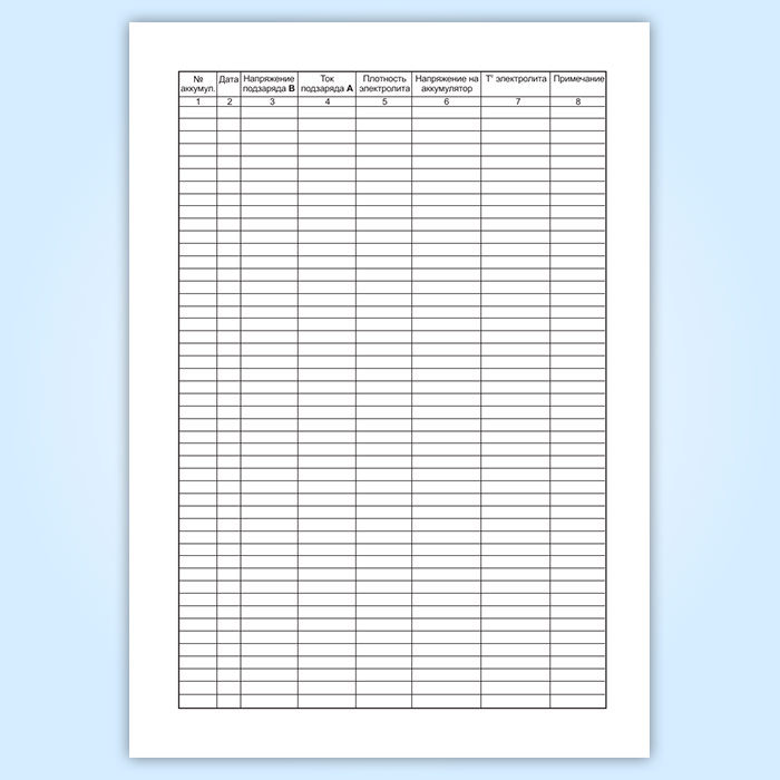 В журнале ведется учет контроля за аккумуляторными батареями, их своевременным обслуживанием, проверкой напряжения и плотности электролита.