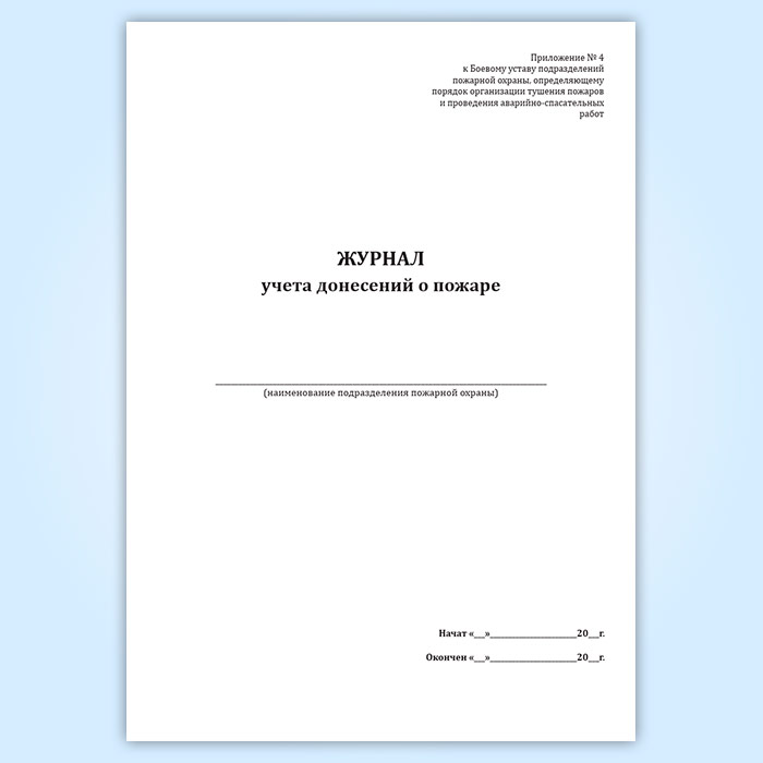 Форма журнала учета донесений о пожаре соответствует Приложению №4 к Боевому уставу подразделений пожарной охраны, определяющий порядок организации тушения пожаров и проведения аварийно-спасательных работ