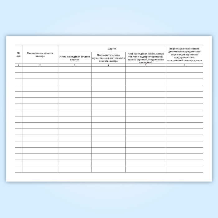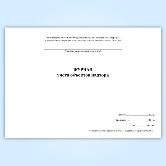 Форма журнала учета объектов надзора соответствует Приложению 3 к Административному регламенту Министерства Российской Федерации по делам гражданской обороны, чрезвычайным ситуациям и ликвидации последствий стихийных бедствий исполнения государственной функции по осуществлению федерального государственного надзора в области защиты населения и территорий от чрезвычайных ситуаций природного и техногенного характера.