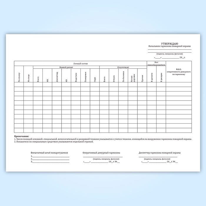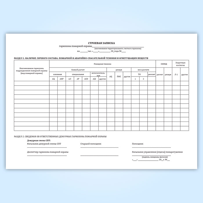 Журнал "Строевая записка гарнизона пожарной охраны" имеет графы: