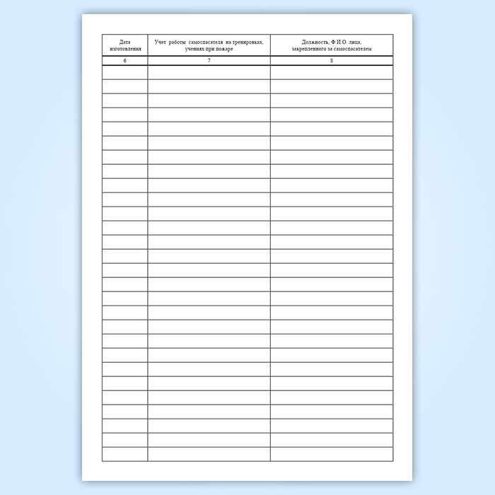 Каждый самоспасатель на предприятии должен быть учтен в журнале учета самоспасателей, где указывается присвоенный самоспосателю порядковый номер. Этот же номер отображается на самоспосателе и записывается в учетную карточку.