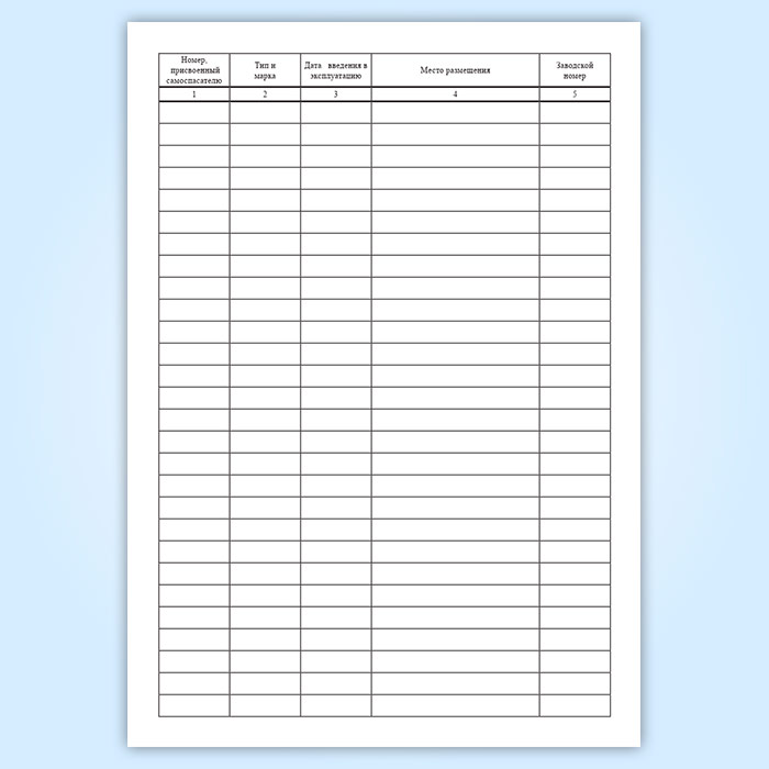 Также в журнале регистрируется тип и марка самоспасателя, дата его ввода в эксплуатацию, место размещения, заводской номер, дата изготовления, отмечается работа самоспасателя на тренировках и учениях.