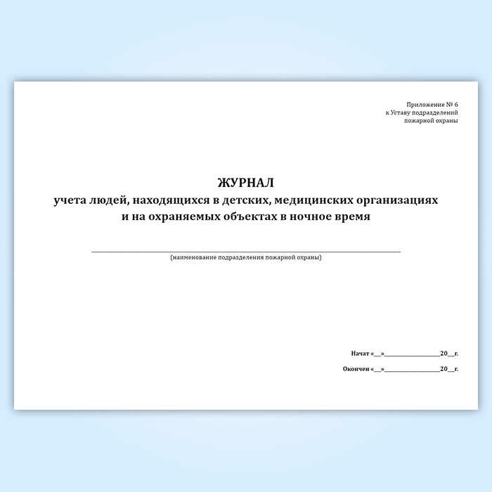 Форма журнала учета людей, находящихся в детских, медицинских организациях и на охраняемых объектах в ночное время соответствует Приложению №6 к Уставу подразделений пожарной охраны