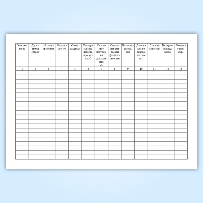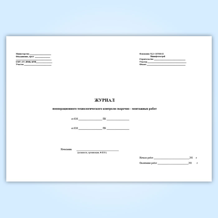 Форма журнала пооперационного технологического контроля сварочно - монтажных работ соответствует Приложению Г к Постановлению Госгортехнадзора РФ от 09.06.2003 N 76 "Об утверждении Правил устройства вертикальных цилиндрических стальных резервуаров для нефти и нефтепродуктов" (Зарегистрировано в Минюсте РФ 19.06.2003 N 4749)