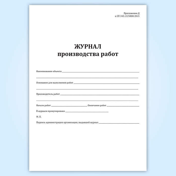 Форма журнала производства работ по нанесению защитного покрытия соответствует Приложению Д к СП 245.1325800.2015 Защита от коррозии линейных объектов и сооружений в нефтегазовом комплексе. Правила производства и приемки работ" .