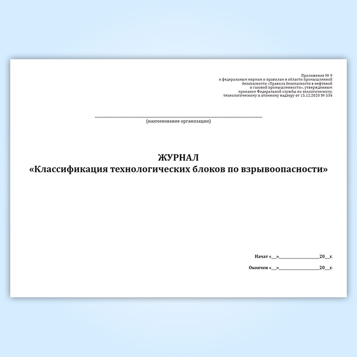 При необходимости, установленной эксплуатирующей организацией, классификация технологических блоков по взрывоопасности осуществляется в соответствии с требованиями ФНП, устанавливающих требования общих правил взрывобезопасности для взрывопожароопасных химических, нефтехимических и нефтеперерабатывающих производств, и приводится в журнале.