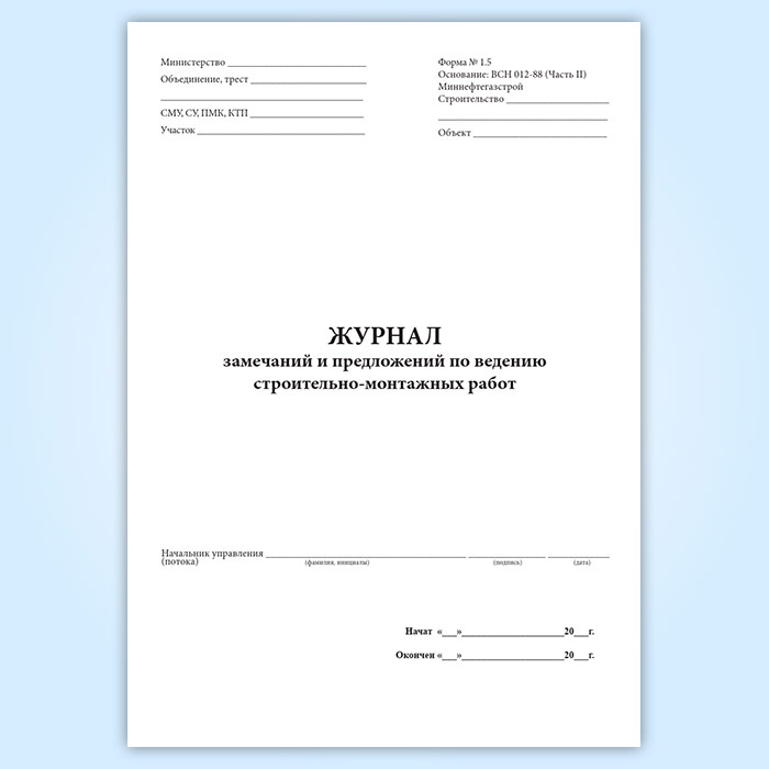 Форма журнала замечаний и предложений по ведению строительно-монтажных работ соответствует Форме № 1.5 ВСН 012-88. " Строительство магистральных и промысловых трубопроводов. Контроль качества и приемка работ. Часть II. Формы документации и правила ее оформления в процессе сдачи-приемки" (утв. Приказом Миннефтегазстроя СССР от 27.12.1988 N 375; Приказом Мингазпрома СССР от 19.05.1989 N 93-ОРГ; Приказом Миннефтепрома СССР от 16.05.1989 N 239).
