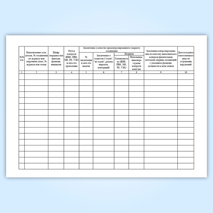 См. также Журнал контроля сварных соединений неразрушающими методами, у которого на 6 граф больше.