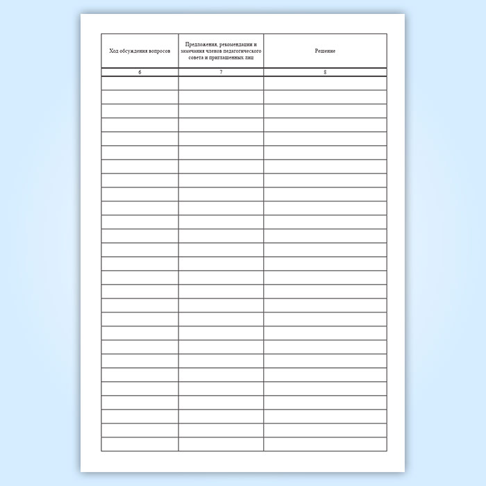 В журнале протоколов записывается повестка дня каждого педсовета, ход обсуждения, предложения и замечания членов педагогического совета, решения, принятые по каждому вопросу.
