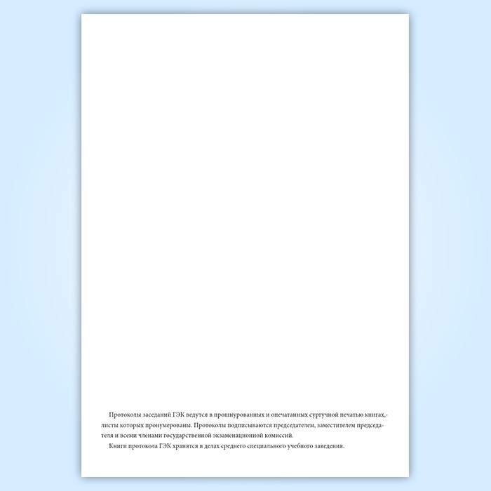 Протоколы подписываются председателем, заместителем председателя и всеми членами государственной экзаменационной комиссий. Книги протокола ГЭК хранятся в делах среднего специального учебного заведения.