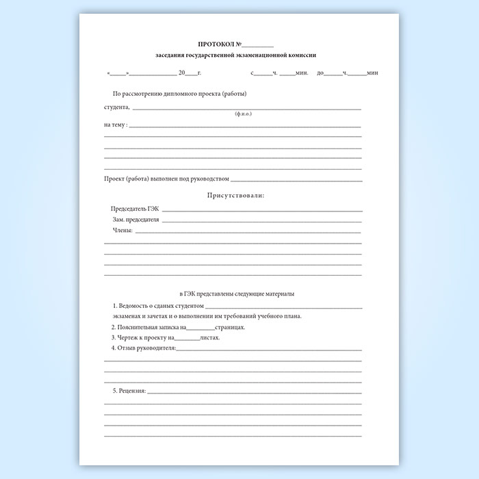 Протоколы заседаний ГЭК заполняются: ручкой (синего цвета) четким, разборчивым почерком или в электронном виде с обязательной последующей распечаткой на бумажном носителе.
