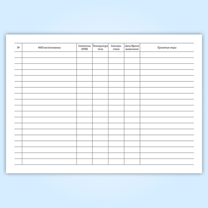 Для профилактики и предупреждения заражения детей ОРВИ рекомендуется вести мониторинг состояния здоровья детей, измерять температуру тела. Если симптомы ОРВИ или гриппа выявлены у воспитанника в течение дня, его необходимо поместить его в специальный бокс, чтобы не допустить заражения остальных детей. Учет воспитанников с выявленными симптомами ОРВИ ведут в журнале, где указывают температуру тела, самочувствие ребенка.