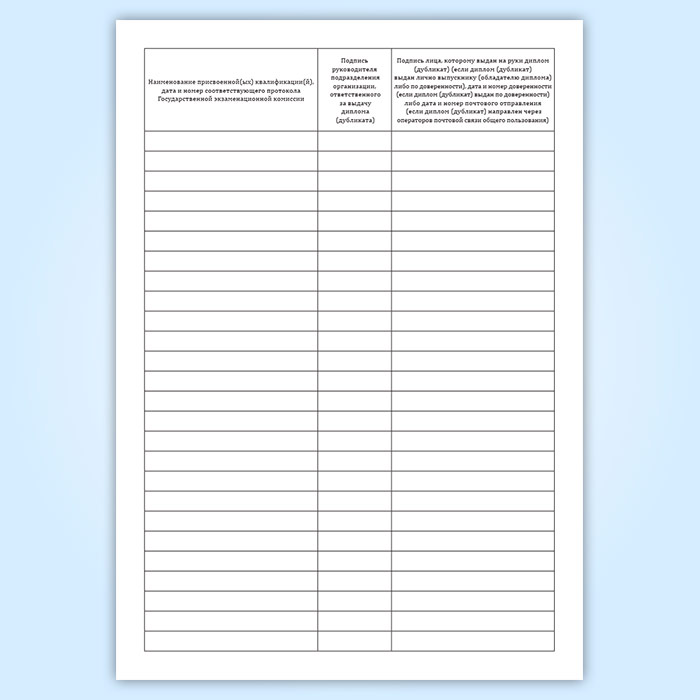 Подпись лица, которому выдан на руки диплом (дубликат) (если диплом (дубликат) выдан лично выпускнику (обладателю диплома) либо по доверенности), дата и номер доверенности (если диплом (дубликат) выдан по доверенности) либо дата и номер почтового отправления (если диплом (дубликат) направлен через операторов почтовой связи общего пользования)