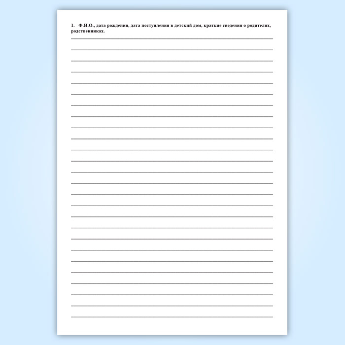 1. Ф.И.О., дата рождения, дата поступления в детский дом, краткие сведения о родителях, родственниках