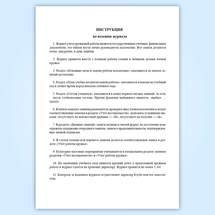1. Журнал учета кружковой работы является государственным учетным, финансовым документом, его обязан вести лично руководитель коллектива. Все записи делаются четко, аккуратно, в день занятия.
