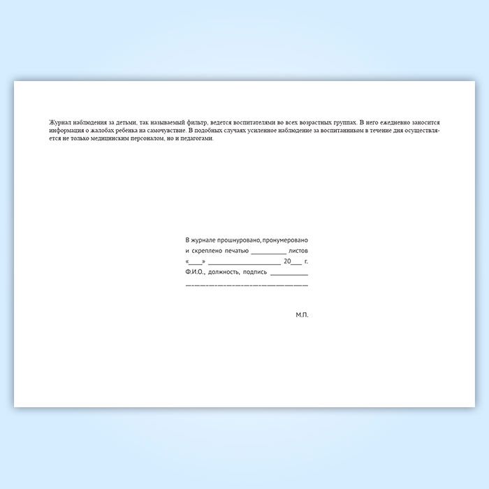 Журнал наблюдения за детьми, так называемый фильтр, ведется воспитателями во всех возрастных группах.
